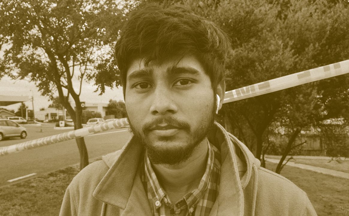 When he hears the gunshots, engineering student Shoaib Gani crawls into a corner and hides behind a table. From his hiding place he sees people fall to the ground and start bleeding. Convinced he is about to die, he calls his family in India to talk to them one last time.